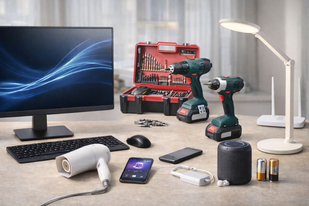 공업적으로 생산된 물품으로서 교류 전원 또는 직류 전원에 연결하여 사용되는 제품이나 그 부분품 또는 부속품을 말함